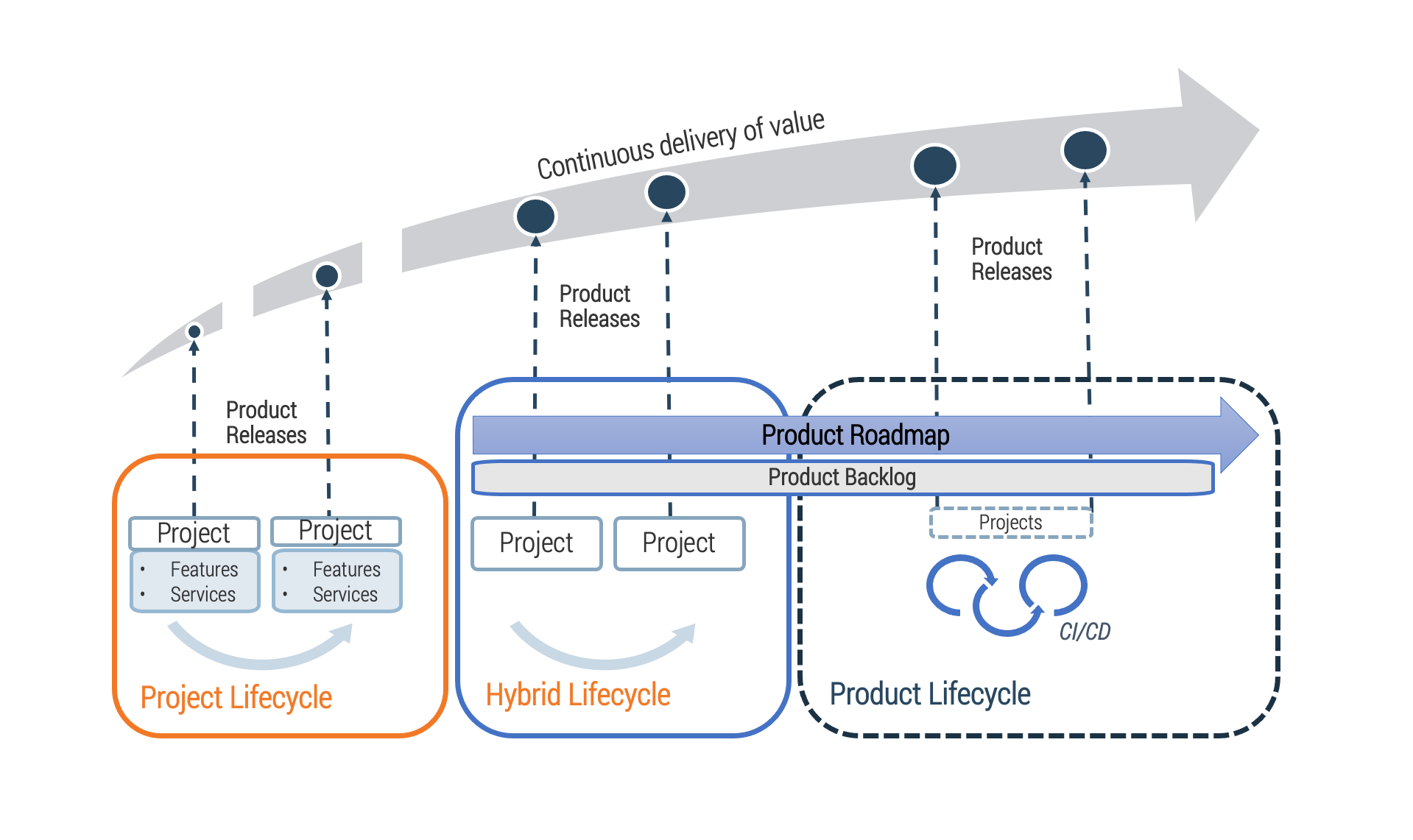 - Projects can still be the source for funding. The project release milestones or phases are tied to the product releases. Project is simply the team funding method for the product lifecycle. In a hybrid model, product owners now use their roadmaps and backlogs to generate and manage release scope. This aligns to your continuous delivery of product value and longer-term alignment to enterprise goals.